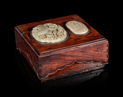 A Celadon Jade Inset Huanghuali Wood Cover Box