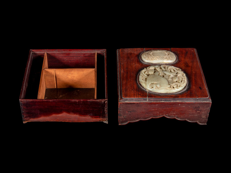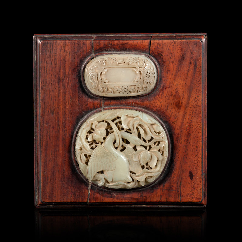 of square form, the cover inset with two celadon jade plaques, the first reticulated and carved to show a goose flying admist lotus blossoms and entwined leafy vines, the second carved and decorated with Buddhist emblems, the cover having shaped and beaded edges.