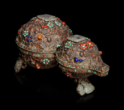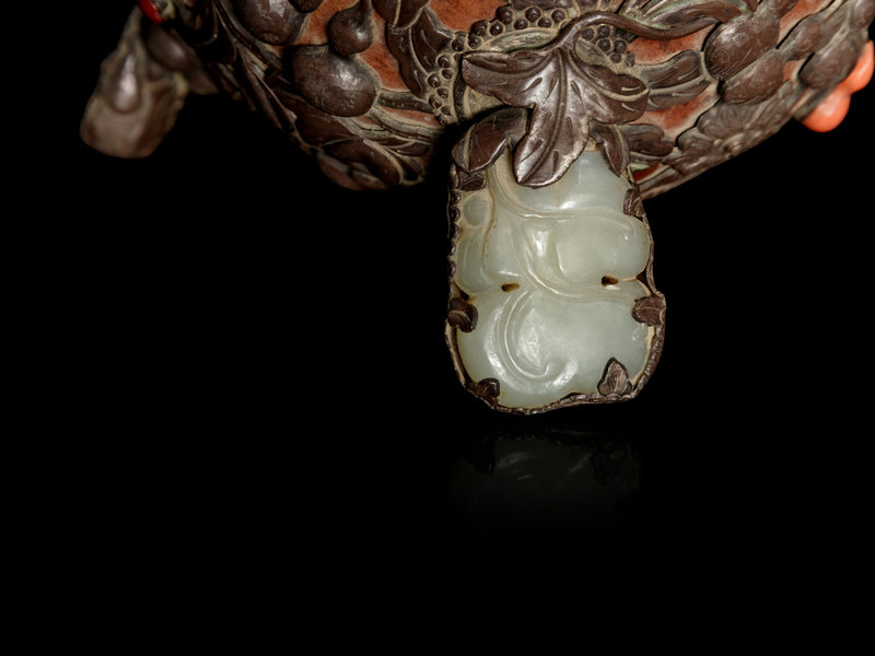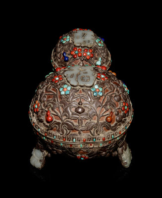 the gourd encased within a silver openwork network of leafy vines bearing blossoms and further gourds, jade inlaid with coral, turquoise and other stones, each lobe centered with a jade fu character, raised on three feet each mounted with a jade carving of double gourds.