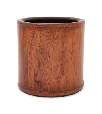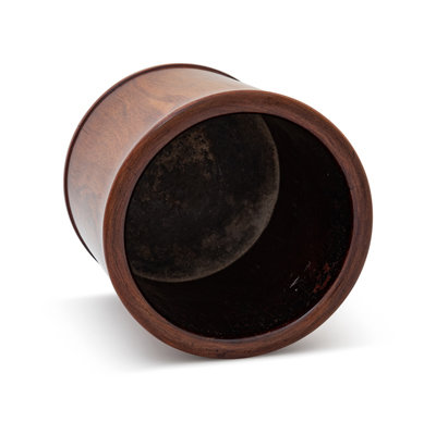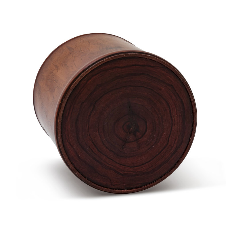 the cylindrical body surmounted a lipped mouth, the wood patinated to a golden brown tone with attractive grain.
