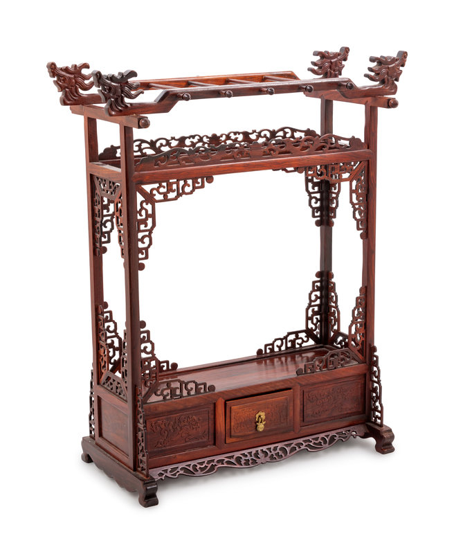 of rectangular section with a pair of hump-back top rails each terminating in dragon heads, each side set with seven hangers, above a large shelf and a small drawer, supported on four square sectioned legs,