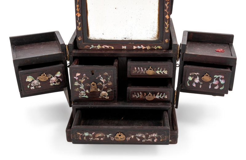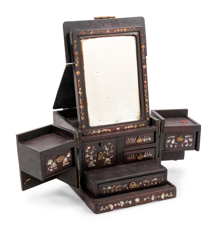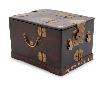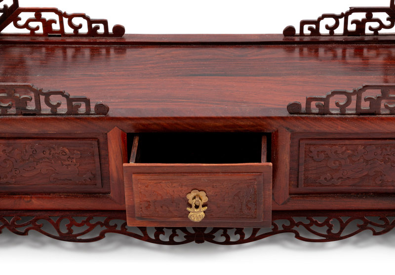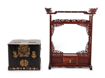 黃花梨雕夔龍紋筆架及銅鑲硬木化妝箱各一件