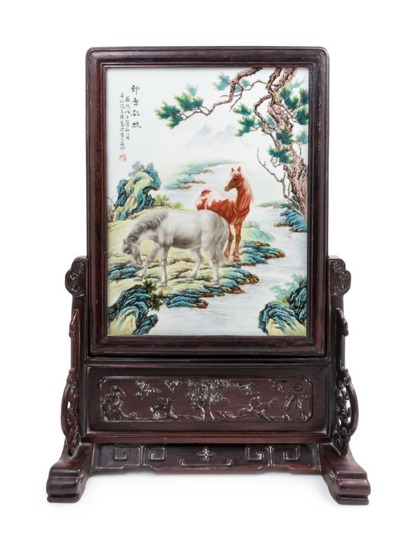 the rectangular porcelain plaque painted to the front showing two horses in a riverscape scene, signed Zhang Zhitang, followed by an artists seal, set in a hongmu frame and stand carved with a panel showing an equestrian scene, above shaped aprons joining the four feet flanked by standing spandrels pierced and carved with sinuous kuilongs.
