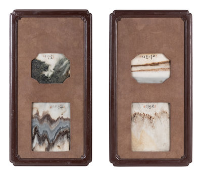 each of rectangular form, inset with two circular dream stone panels with inscriptions, mounted with hardwood frames.