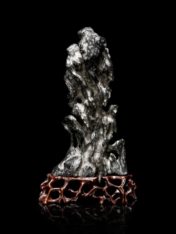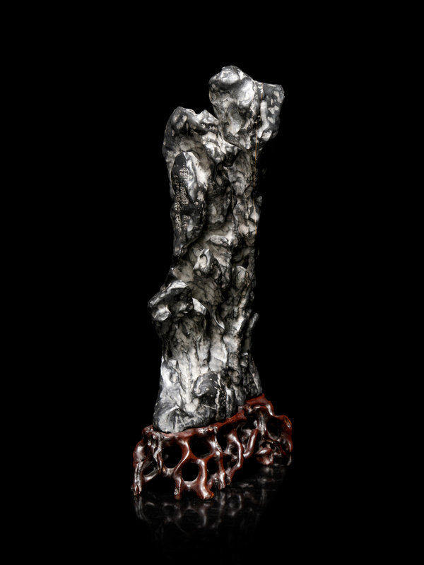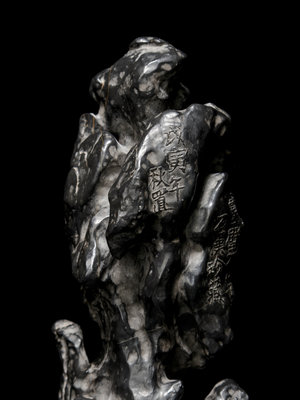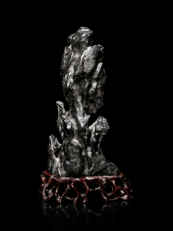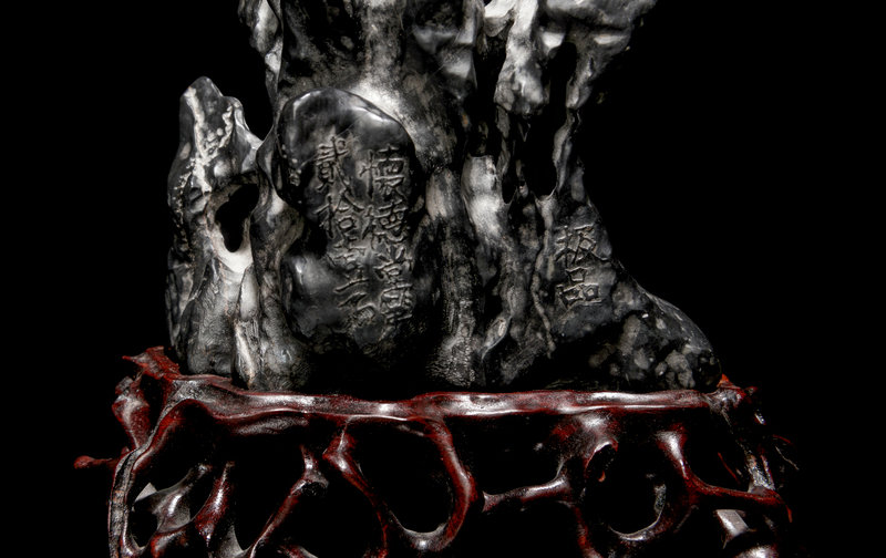 the vertical rock pierced with various openings and incised with inscriptoins, raised on a fitted hardwood stand.