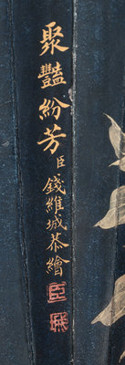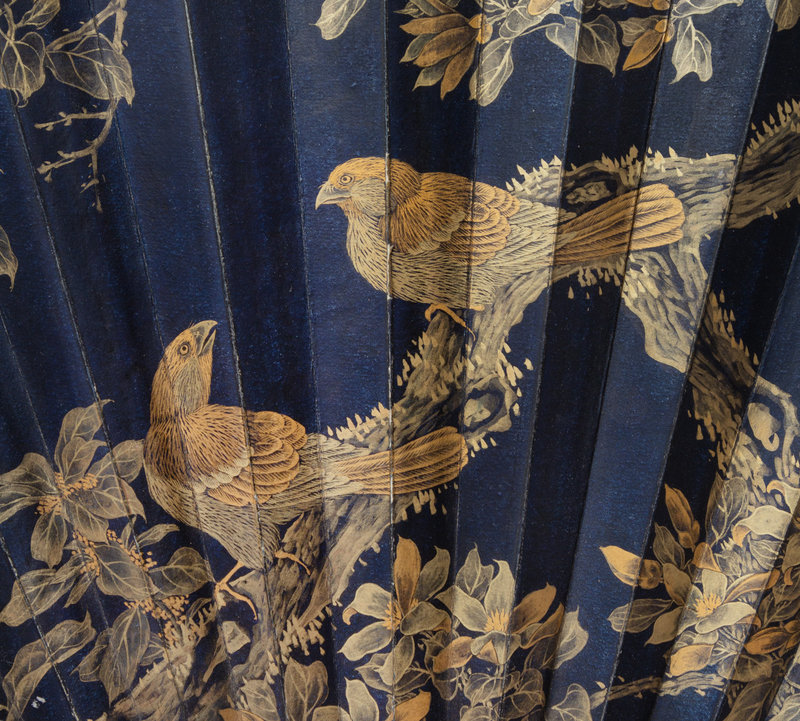 The present lot demonstrates the culmination of a collaborative effort between three members of the imperial cabinet dear to the Qianlong emperor, made during the golden years of his reign in the eighteenth century. Of this fan, the guard bears refined calligraphy by Ji Yun in an inscription of an imperial poem, while scholar-official Liang Shizheng provided luxurious and attentive calligraphy of ten classic Tang verses selected by the emperor to describe vignettes of spring and its sense of boundless possibility. Finally, Qian Weicheng lent a hand more familiar with landscape to a rarely seen bird and flower painting.