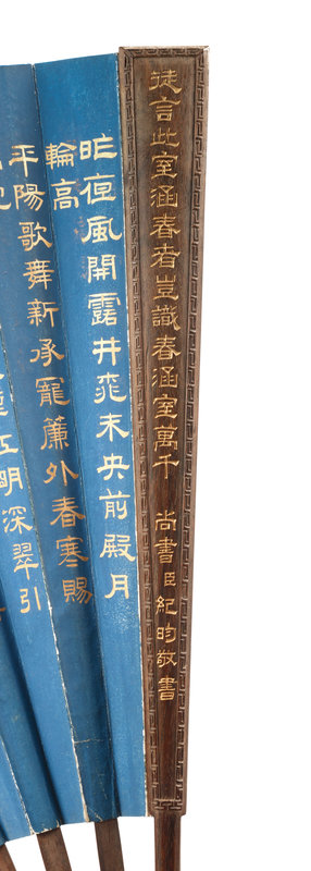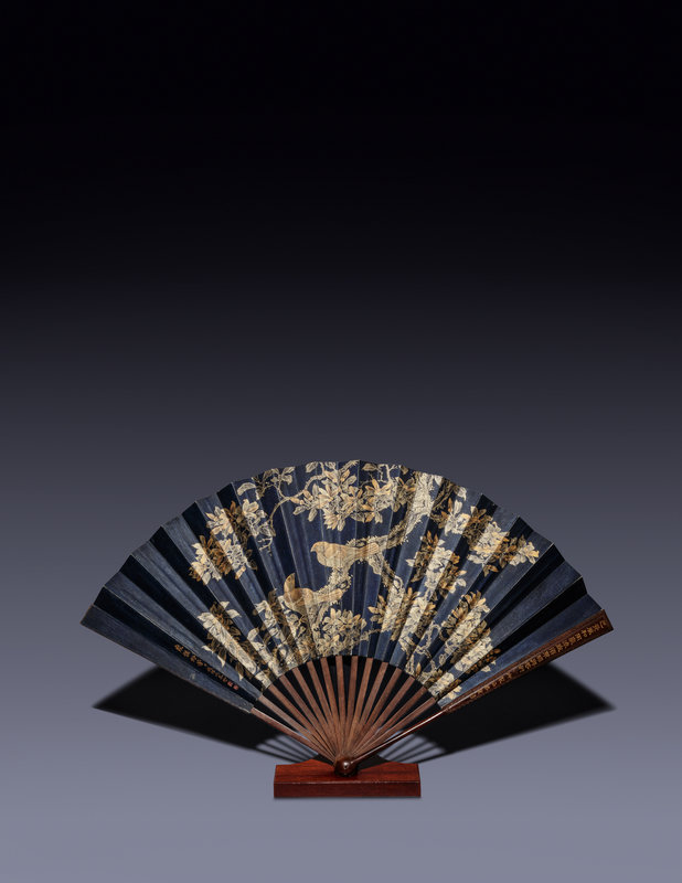 Examples of similar imperial fans are held in the collections of both the Palace Museum in Beijing and the National Place Museum in Taipei. These extant examples largely consist of works considered in their time as precious examples; whereas the Hanchun studio described in Qianlong’s poem inscribed on the present lot in the Hall of Mental Cultivation was a location frequented by the emperor. Indeed, the ribs show old traces from opening and retracting quite possibly borne by imperial hand.