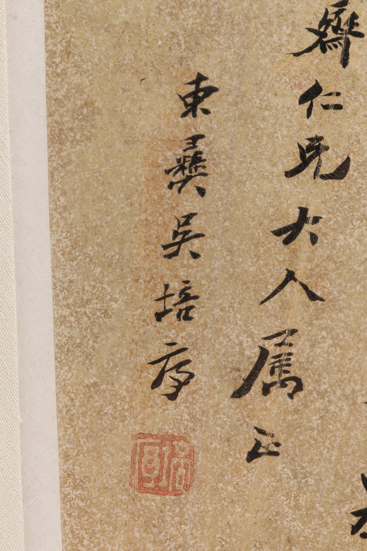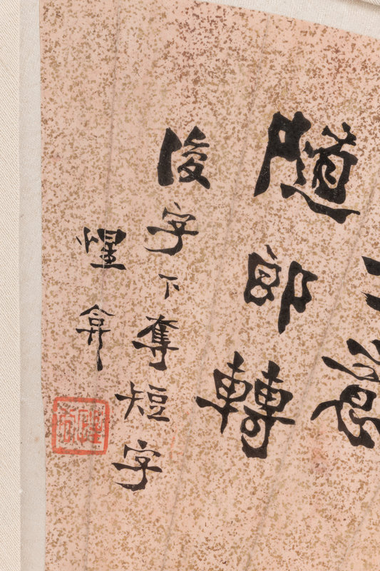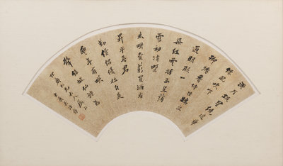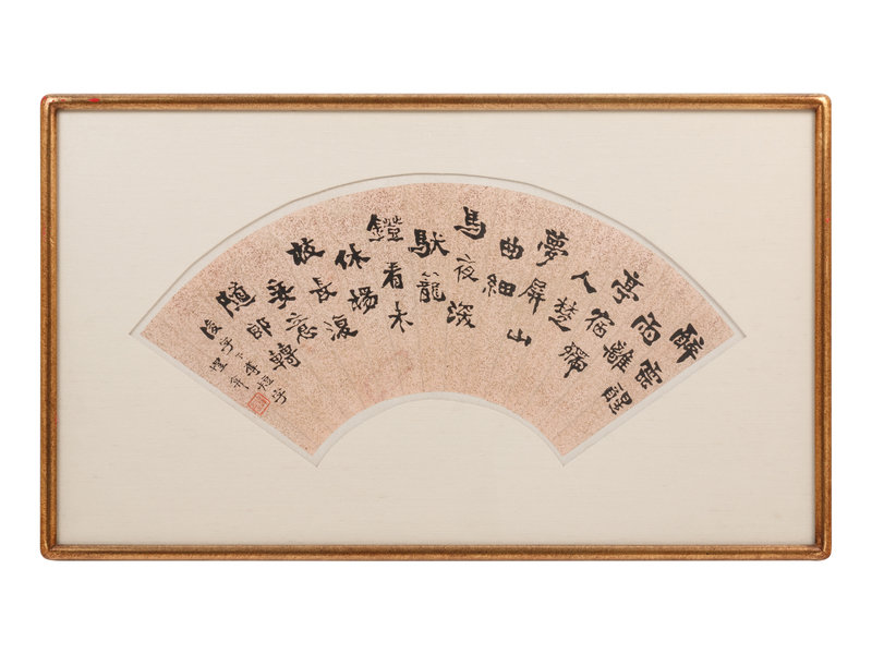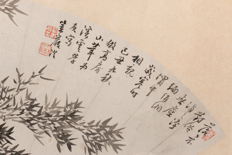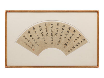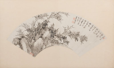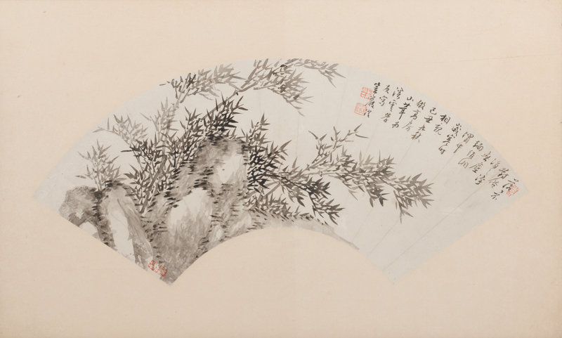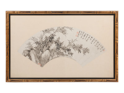 one depicting bamboo and rocks, two with calligraphy on gilt paper, each signed, sealed and framed.