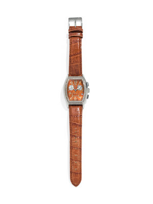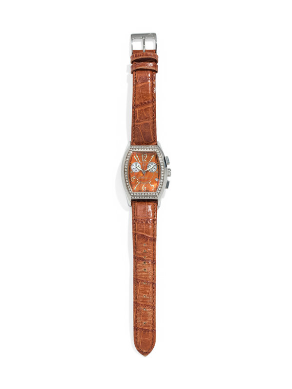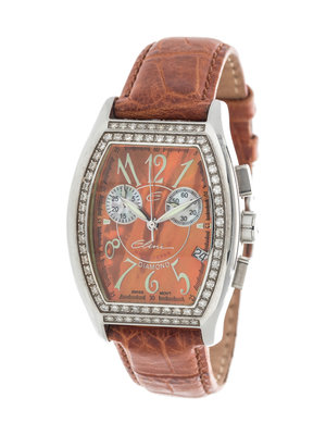 32.00 x 37.00 mm case dimension exclusive of lugs, the bezel containing 72 round brilliant cut diamonds, orange mother-of-pearl dial, luminous Arabic numerals, subdials for seconds at 3 and 9 o'clock, date aperture at 4 o'clock, tonneau shaped case, quartz movement, leather strap signed Elini, steel tang buckle.