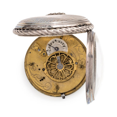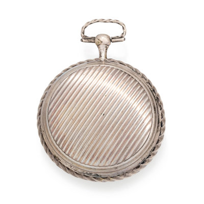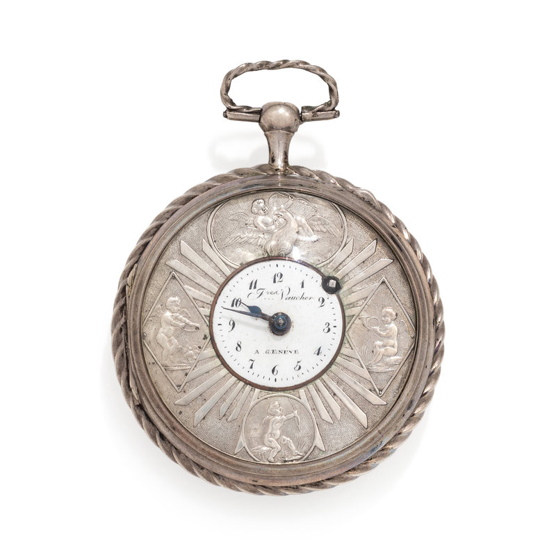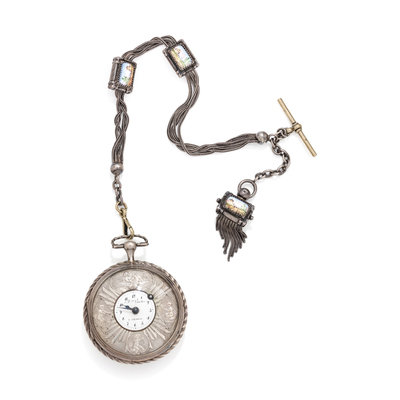60.00 mm case diameter, outer silver ring with repousse putti, inner white porcelain dial, black Arabic numerals, key wound and set verge fusee gilt movement signed Fred Vaucher, with attached silver fob chain consisting of four wheat chains interspersed with painted porcelain scenes.