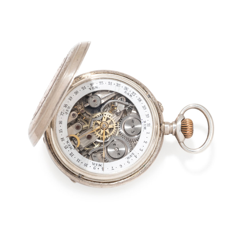 SILVER PERPETUAL CALENDAR OPEN FACE POCKET WATCH