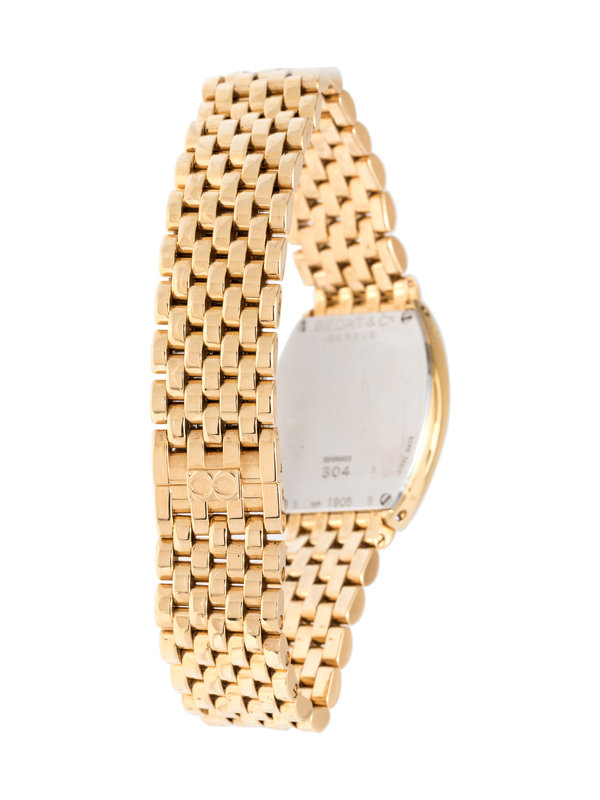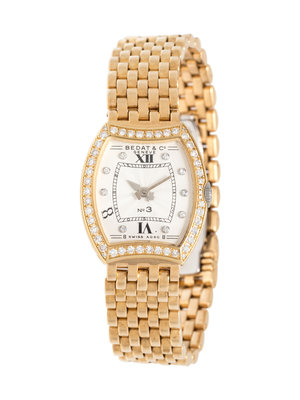 27.00 x 24.00 mm case dimensions, the bezel containing 48 round brilliant cut diamonds, silver guilloche dial, single cut diamond and Roman numerals, tonneau shaped case with stainless steel case back, self-winding movement, yellow gold link bracelet, steel deployant clasp signed BEDAT & Co.