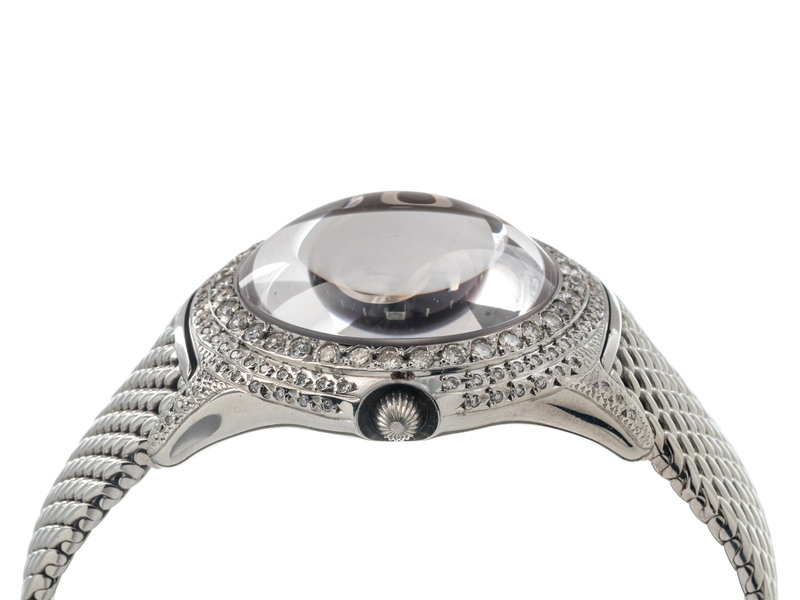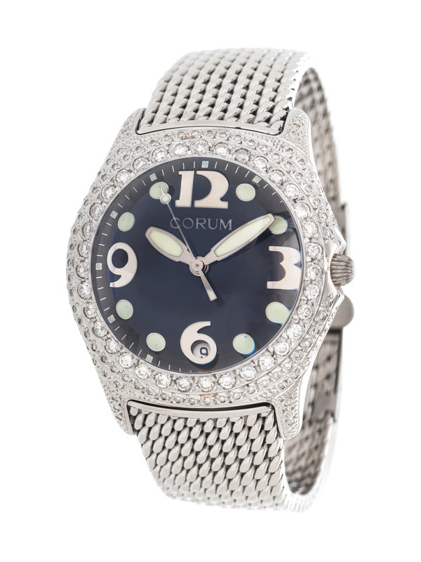 46.00 mm case diameter, the bezel and lugs containing 129 round brilliant cut diamonds weighing approximately 2.55 carats total, navy dial with convex 'bubble' crystal, luminous dot and applied Arabic numerals, date aperture at 6 o'clock, quartz movement, mesh link bracelet, double deployant clasp.