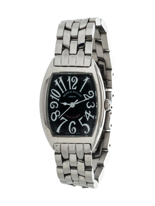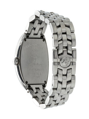 24.00 x 35.00 mm case dimensions, black guilloche dial, white Arabic numerals, tonneau shaped case, quartz movement signed FRANCK MULLER, polished link bracelet, double deployant clasp.