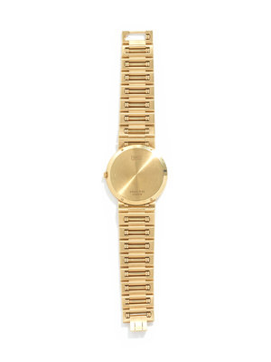 30.00 mm case diameter, matte gold dial, gold dot numerals, quartz movement, integrated fancy link bracelet, fold over clasp.
