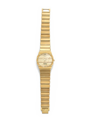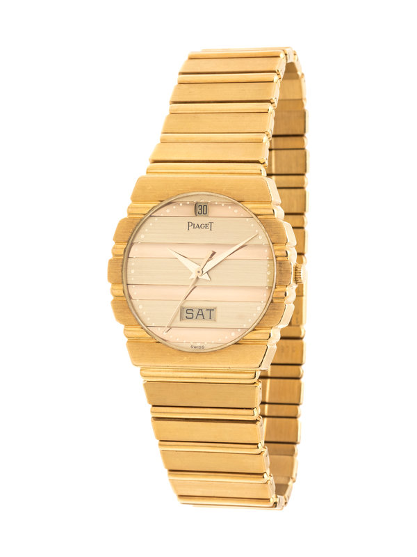 31.00 mm case diameter, matte and polished gold dial, applied gold dot numerals, date aperture at 12 o'clock, day aperture at 6 o'clock, quartz movement, integrated polished and matte gold bracelet, fold over clasp with Piaget logo.