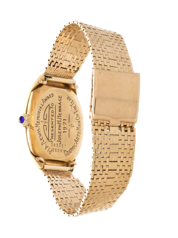 35.00 x 30.00 mm case dimensions including lugs, matte gold dial, black Roman numerals, manual wind movement, personalized engraving on case back, flexible brick link bracelet, deployant clasp.