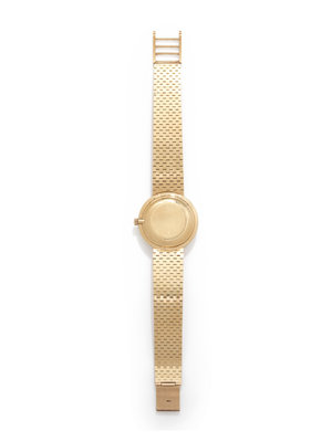 33.00 mm case diameter, brushed gold dial, applied gold baton numerals, date aperture at 6 o'clock, self-winding movement, integrated textured brick link bracelet, fold over clasp.