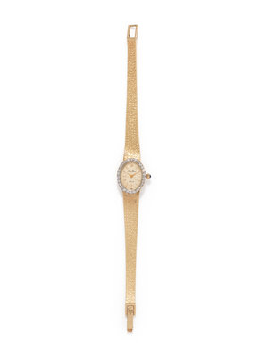 20.00 x 16.00 mm case dimensions, the bezel containing 26 single cut diamonds, textured gold dial with applied gold baton numerals, quartz movement, integrated textured mesh link bracelet, fold over clasp.