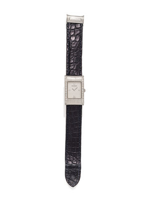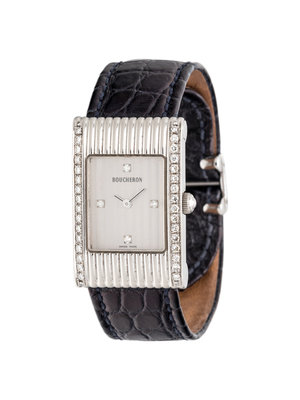 32.00 x 20.00 mm case dimensions, the bezel containing 36 round brilliant cut diamonds, grooved case and dial with four single cut diamond numeral markers, quartz movement, black lizard strap with clasp signed BOUCHERON.