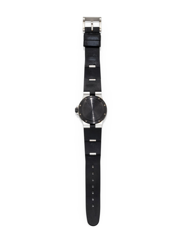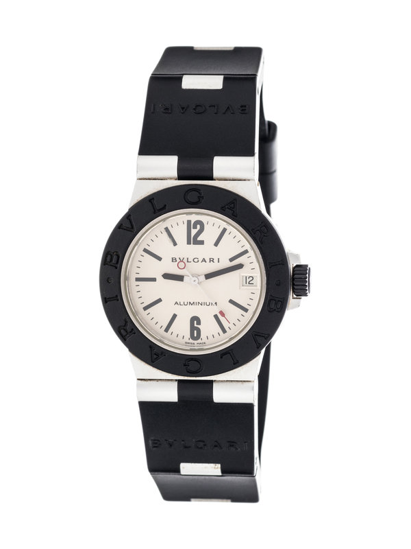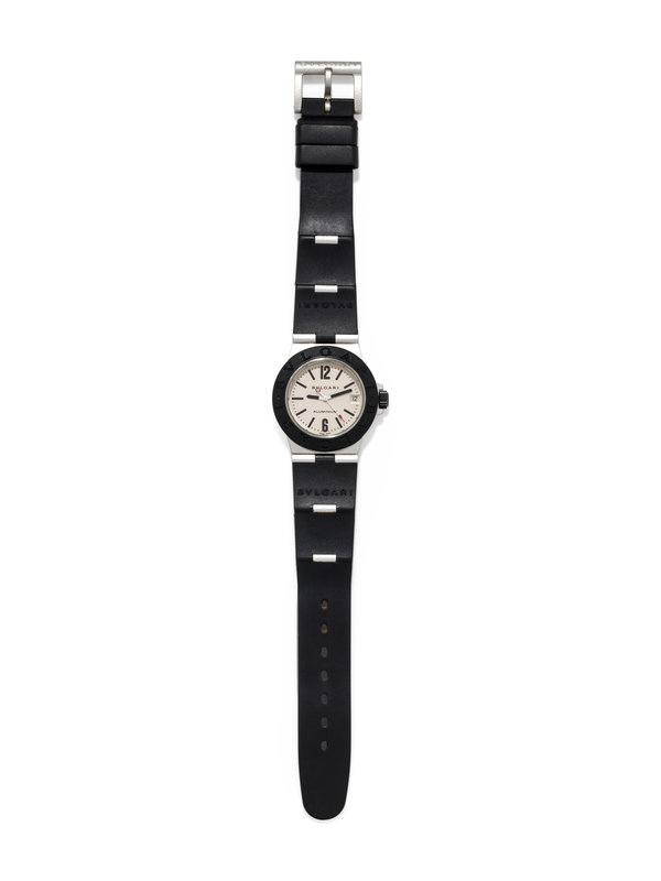 32.00 mm case diameter, cream dial, black Arabic and baton numerals, center seconds in white and red, date aperture at 3 o'clock, black rubber bezel, quartz movement, hinged rubber and aluminum link bracelet, aluminum tang buckle signed BVLGARI.
