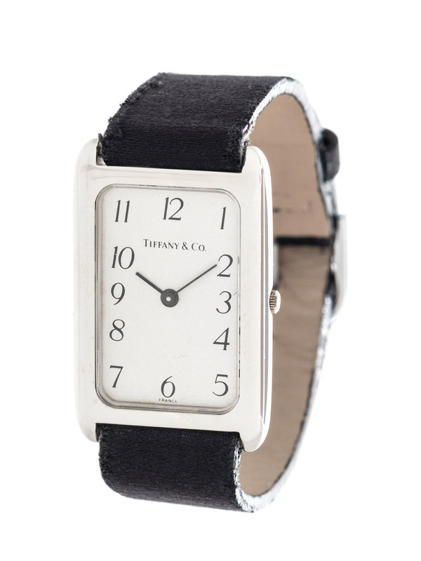 34.00 x 22.00 mm case dimensions inclusive of lugs, off white dial, black Arabic numerals, quartz movement, black nylon leather-backed strap signed TIFFANY & CO., base metal tang buckle.