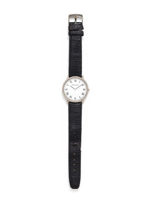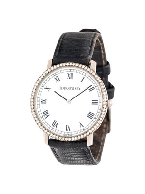 33.00 mm case diameter, the bezel containing 72 round brilliant cut diamonds, white dial, black Roman numerals with outer chapter ring, quartz movement, black leather strap signed TIFFANY & CO., base metal tang buckle signed TIFFANY & CO.