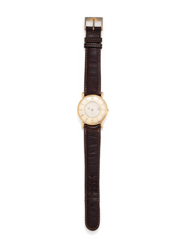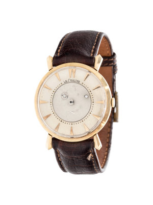 31.00 mm case diameter, silvered dial with central rotating "mystery" disc design, triangular numerals, Cal. 480/CW manual wind 17 jewel movement signed LECOULTRE Co., brown leather strap with gold-filled tang buckle.