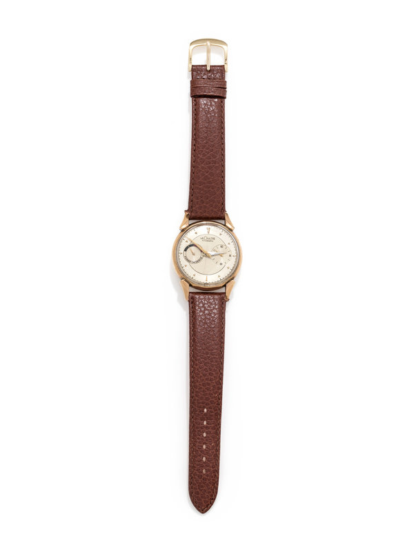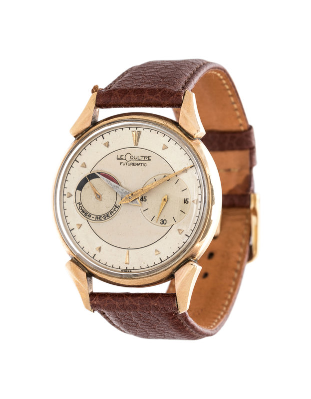35.00 mm case diameter, matte silvered dial, applied gold triangular numerals, subdial for seconds at 3 o'clock and power reserve at 9 o'clock, Cal. 497 17 jewel self-winding movement signed LE COULTRE Co, brown leather strap, gold tone tang buckle.