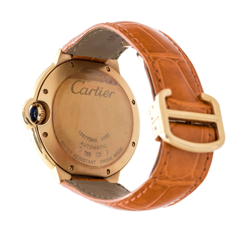 Case back stamp: Cartier 128773MX 3002 AUTOMATIC 750 (hallmark) WATER RESISTANT SWISS MADE.