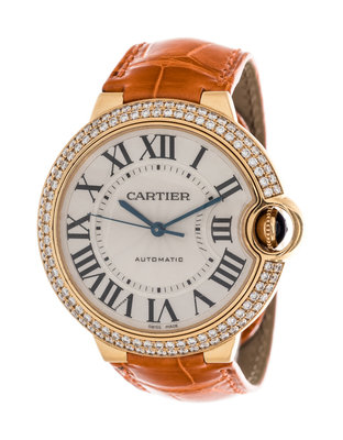 36.00 mm case diameter, the bezel containing numerous round brilliant cut diamonds, two section dial consisting of a silvered guilloche center and a silvered ridged outer border, black Roman numerals, center sweep seconds hand, self-winding movement, orange leather strap, double deployant clasp signed Cartier.
