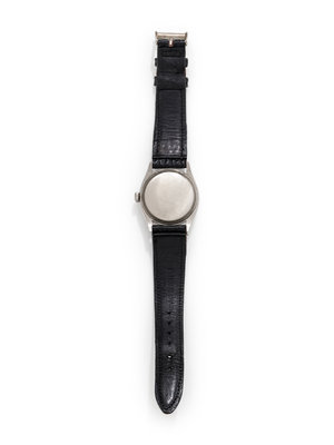 40.00 x 32.00 mm case dimensions inclusive of lugs, matte silvered dial, applied yellow gold triangular numerals, center sweep seconds hand, Cal. 620 self-winding movement, black leather strap, base metal tang buckle.