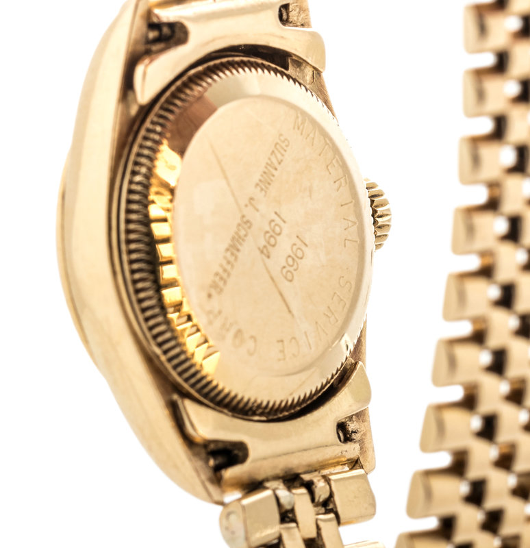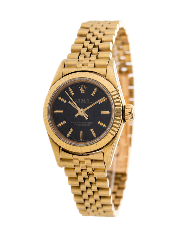 25.00 mm case diameter, black dial, applied luminous baton numerals, gold coin edge bezel, Cal. 2130 self winding 29 jewel movement, yellow gold Jubilee link bracelet, deployant clasp.