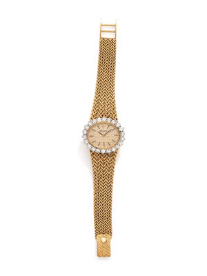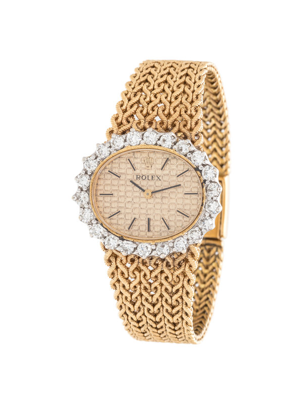 25.00 x 30.00 mm case dimensions, the bezel containing 22 round brilliant cut diamonds, gold basket weave dial, applied black and gold baton numerals, Cal. 1400 17 jewel manual wind movement signed ROLEX, integrated textured mesh link bracelet, fold over clasp with Rolex logo.