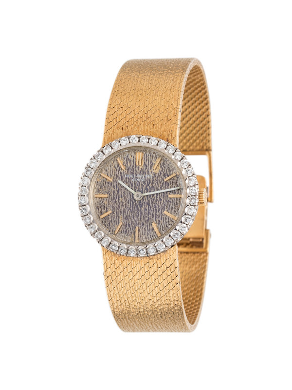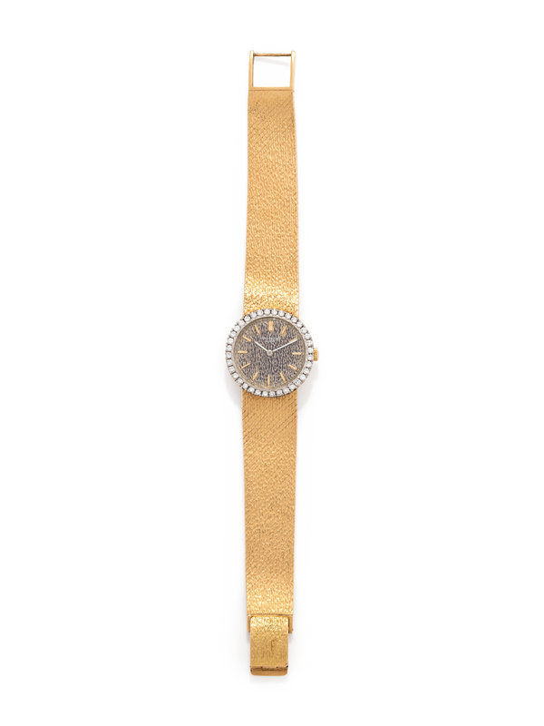 23.00 mm case diameter, the bezel containing 36 round brilliant cut diamonds, textured dial, gold baton numerals, 20 jewel manual wind movement adjusted to heat, cold, isochronism and five positions signed PATEK, PHILIPPE & Co., integrated textured mesh link bracelet, fold-over clasp.