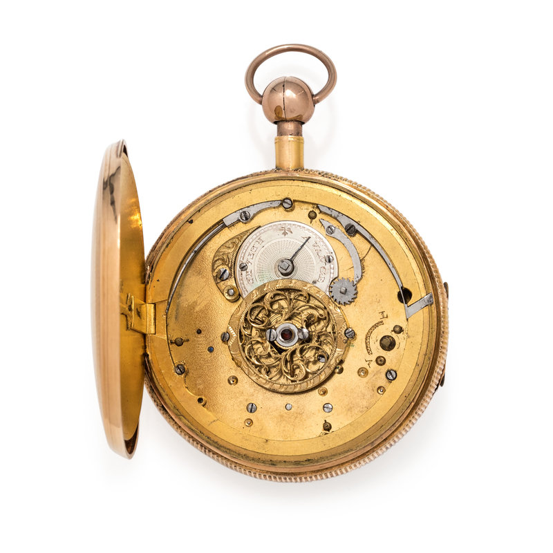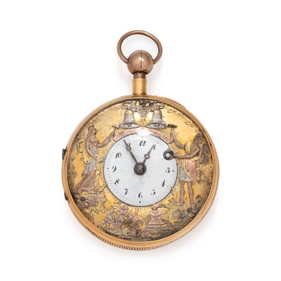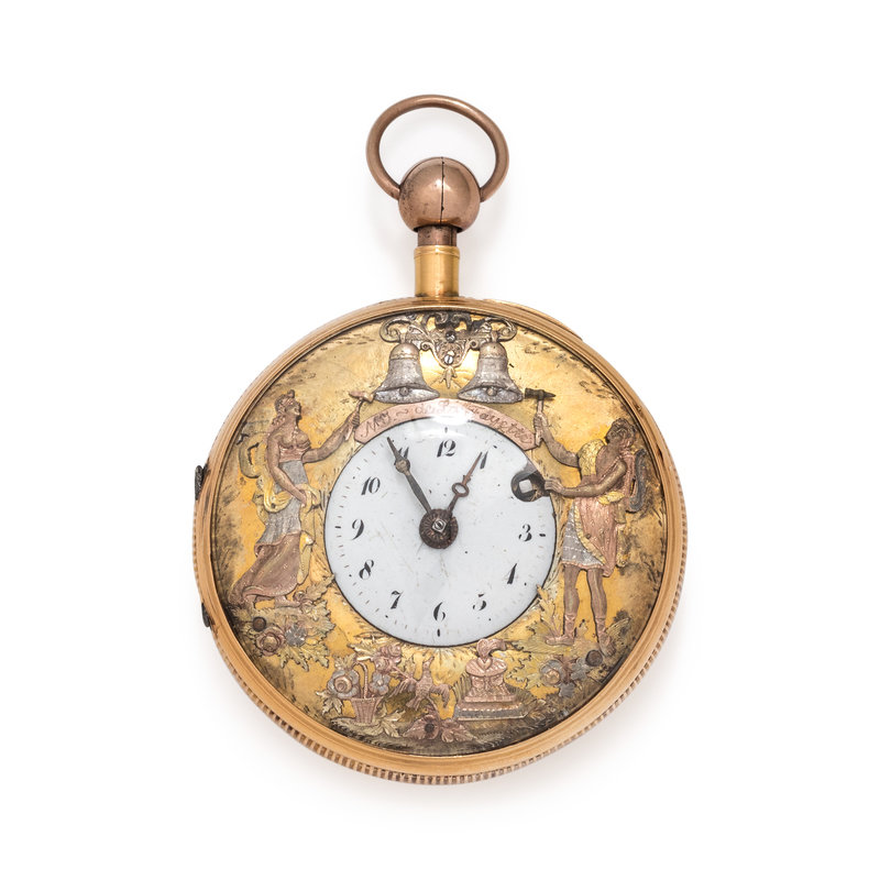 50.00 mm case diameter, white enamel dial, black Arabic numerals with outer chapter ring calibrated to 60 minutes, gold outer border, plate between the gongs engraved Mq de La Fayette, accented with tricolor gold Jacquemart automatons striking bells depicting Orpheus and Eurydice above the altar of Cupid with doves and a flower basket, crown and stem are depressed to activate quarter repeating function, 18 karat gold guilloche back cover with cartouche engraved “M de”, gilt brass cuvette with decorative figural hinge, fusee with chain, verge escapement.