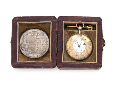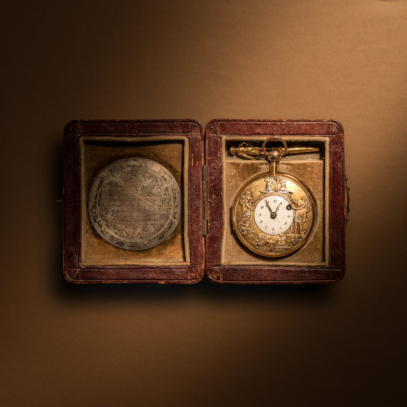 Accompanied by a fitted tooled leather case with an inner silver medallion engraved "Montre +1750+de Marie-Joseph Marquis de La Fayette.= Monogr' M-J de LF