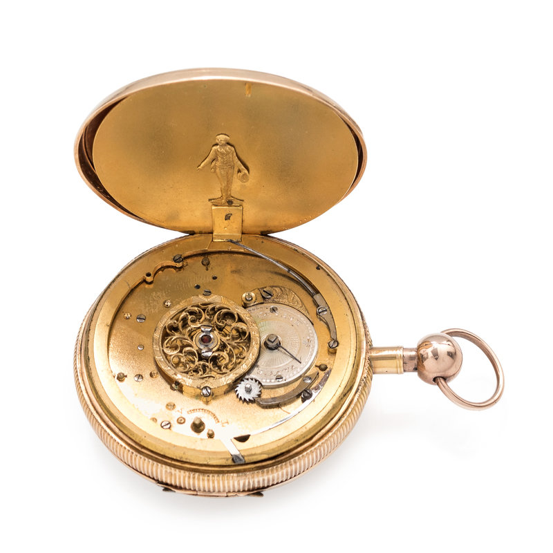 A HISTORIC 18K TRICOLOR GOLD OPEN FACE JACQUEMART AUTOMATON QUARTER REPEATER POCKET WATCH