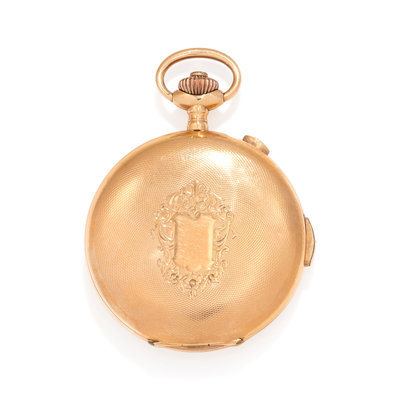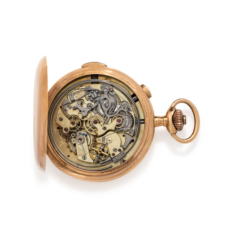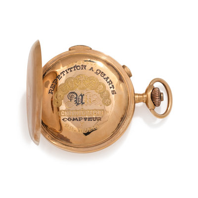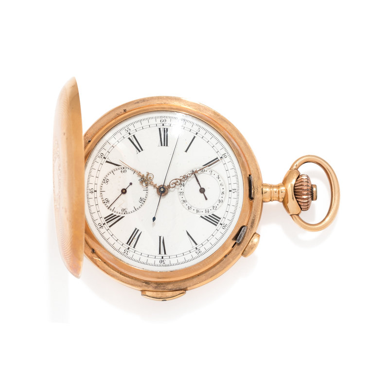 18K YELLOW GOLD CHRONOGRAPH QUARTER REPEATER HUNTER CASE POCKET WATCH