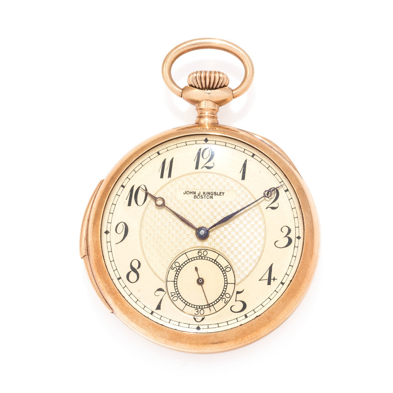 44.00 mm case diameter, matte and textured gold dial, black Arabic numerals, subdial for seconds at 6 o'clock, polished cuvette, stem wound and set 16 jewel nickel movement with repeater function signed JOHN J. KINGSLEY.