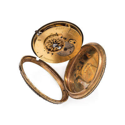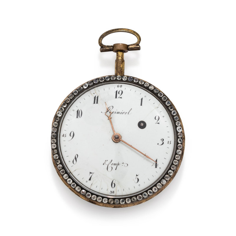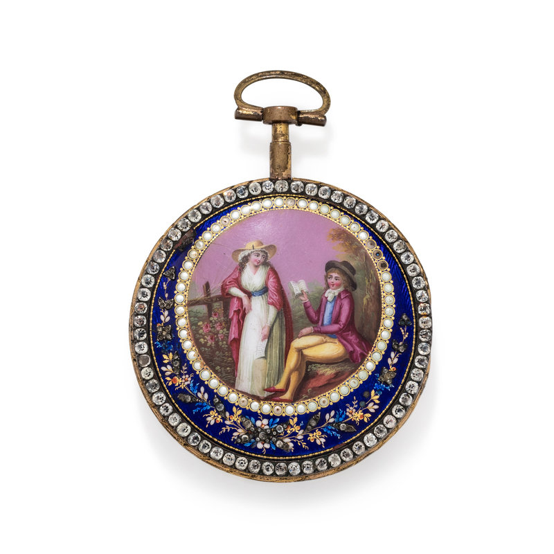 58.00 mm case diameter, white dial, black Arabic numerals with outer chapter ring calibrated to 60 minutes, key wound and set gilt verge fusee movement signed Reimirol & Compe, the bezel and case back containing numerous paste rhinestones, case back with blue enamel and floral decoration and painted enamel pastoral scene with pearl simulant surround.