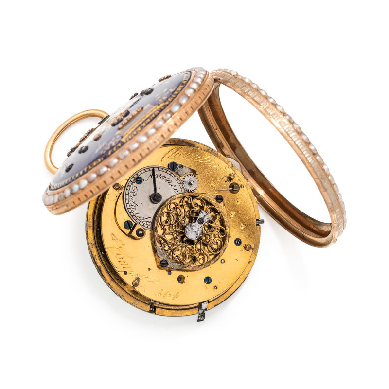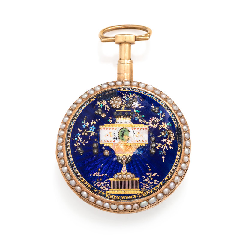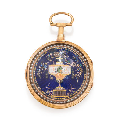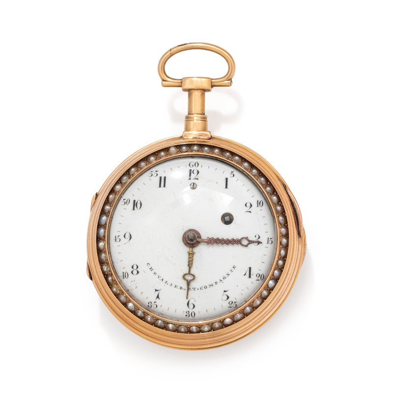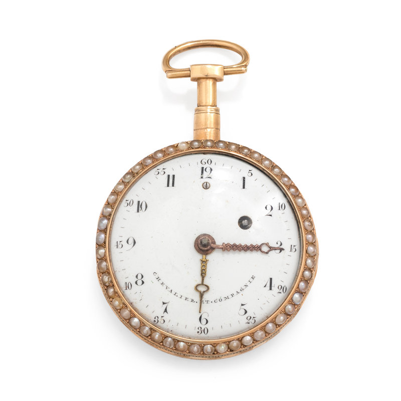 53.00 mm case diameter, white dial, black Arabic numerals with outer chapter ring calibrated to 60 minutes, key wound and set gilt verge fusee movement signed Chevalier & Compe, the bezel and case back containing numerous pearls (origin not tested), case back with blue guilloche enamel surmounted with a gilt flower urn containing rose cut diamonds and polychrome enamel detail, with pair case attachment.