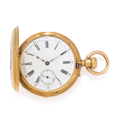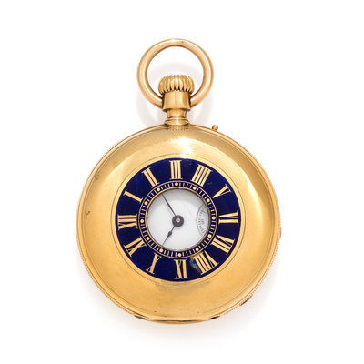 46.00 mm case diameter, white single sunk dial, black Roman numerals with outer chapter ring calibrated to 60 minutes, subdial for seconds at 6 o'clock, demi-hunter case with Roman numerals and blue enamel, lever set stem wound gilt movement.