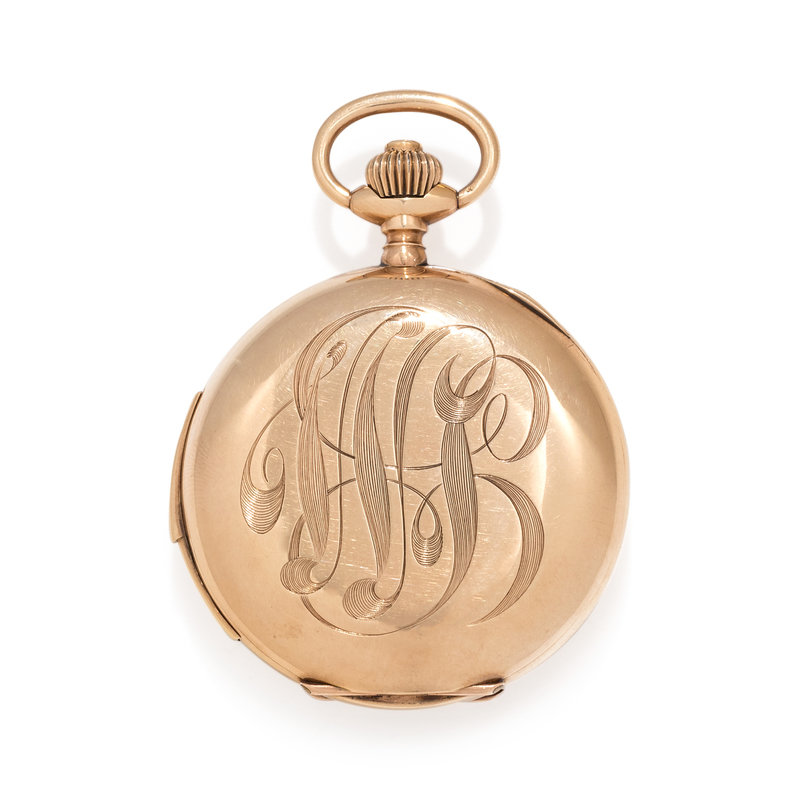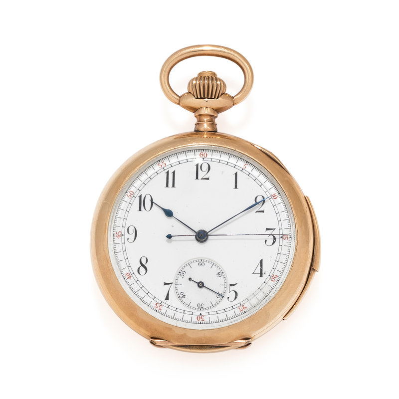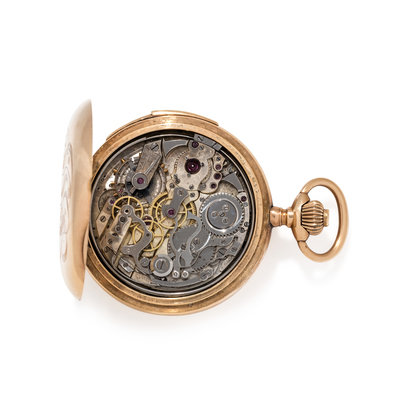 50.00 mm case diameter, white dial, black Arabic numerals with outer chapter ring calibrated to 60 minutes, subdial for seconds at 6 o'clock, polished cuvette, stem wound and set jewelled gilt and nickel movement with repeater function, monogram engraved case back.