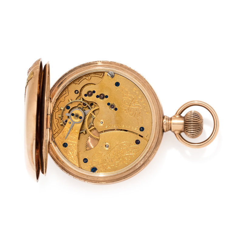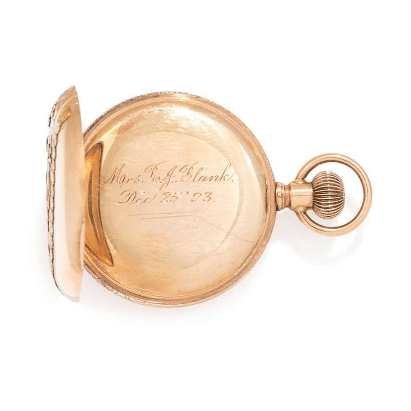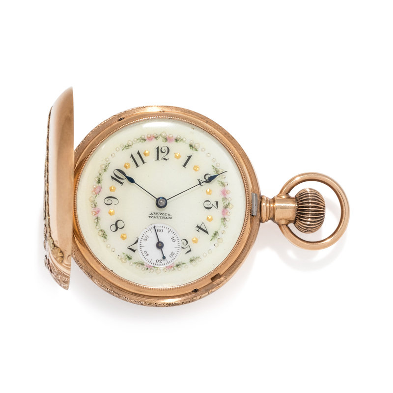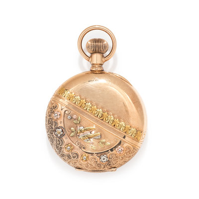 40.00 mm case diameter, cream dial with painted floral detail, black Arabic numerals, subdial for seconds at 6 o'clock, polished cuvette with personalized engraving, stem wound and set 11 jewel gilt movement signed AMERICAN WALTHAM WATCH Co., the case with applied white and yellow gold flower and bird motifs and engraved detail.
