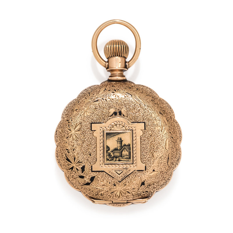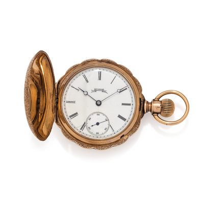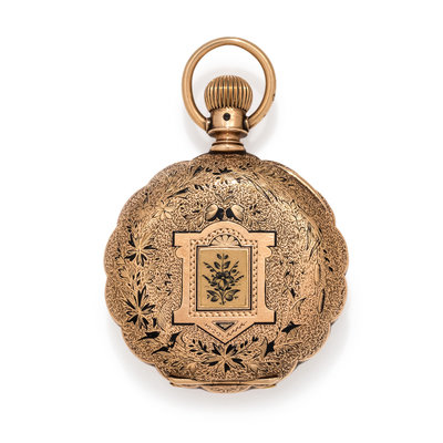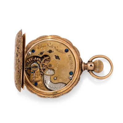40.00 mm case diameter, white dial, black Roman numerals, subdial for seconds at 6 o'clock, polished cuvette with personalized engraving, lever set stem wound 15 jewel gilt movement signed Elgin Nat'l Watch Co., the case with all over floral engraving and central etched plaques within engraved cartouches on front and reverse.