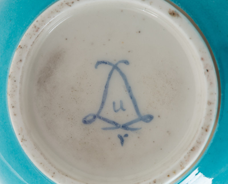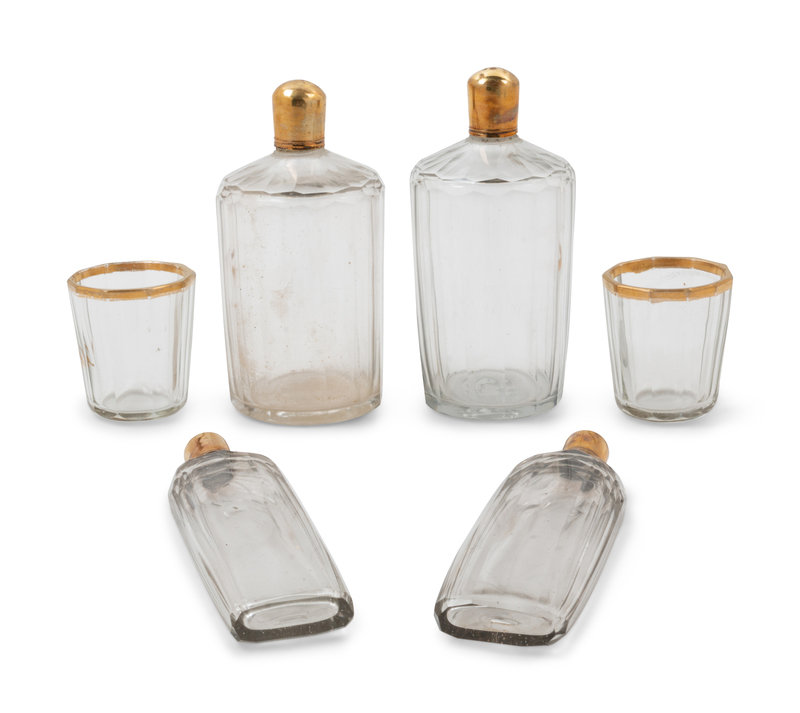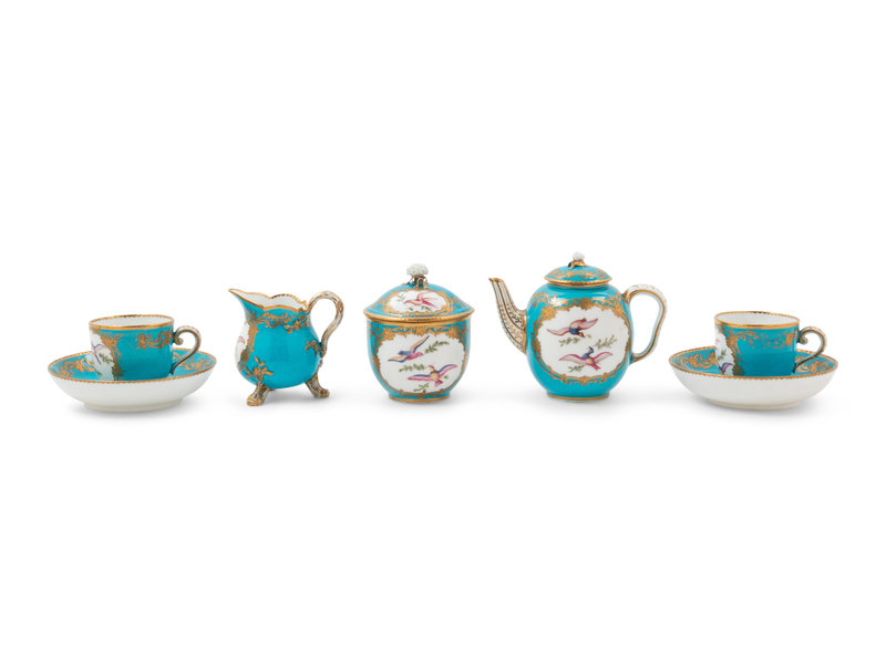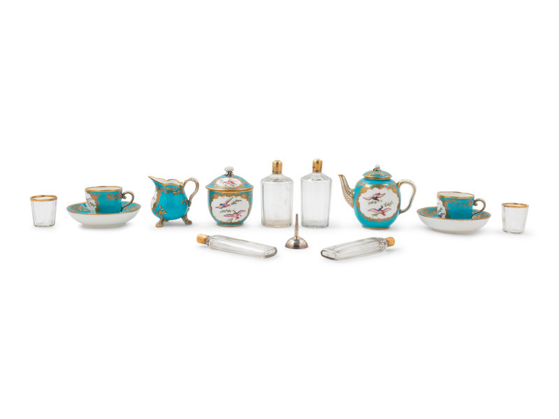 comprising 2 teacups and saucers; 2 cordial glasses; a diminutive teapot; a covered sugar; a creamer; 2 cordial bottles and a funnel; the teapot, covered sugar and 2 teacups bearing interlaced Ls enclosing the date letter U to the underside; the saucers bearing vacant interlaced Ls to the underside.