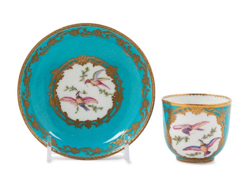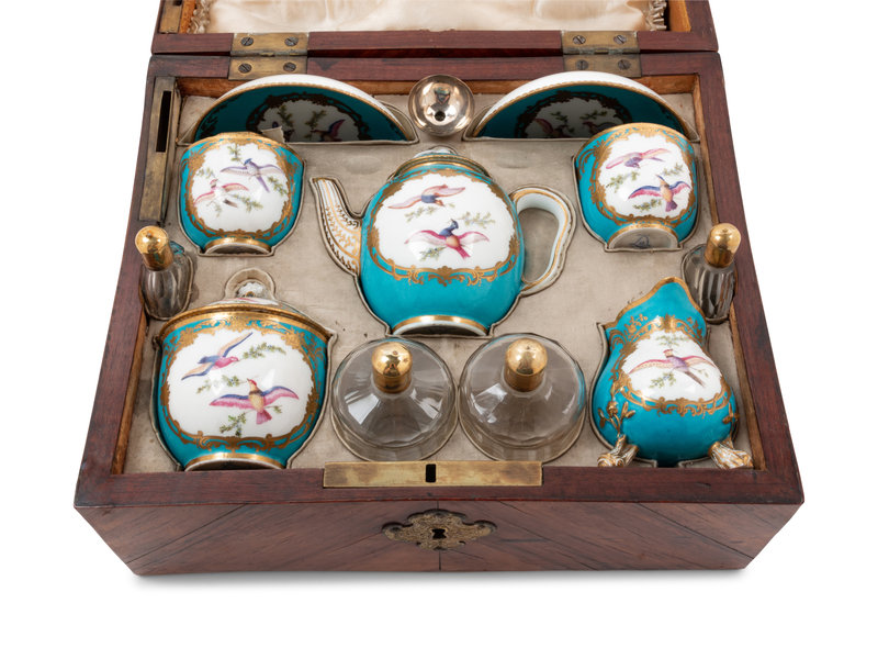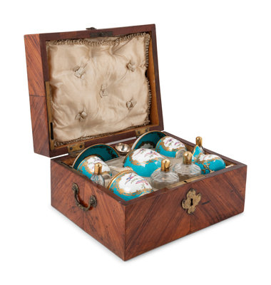 A Sèvres Painted and Parcel Gilt Porcelain Tea and Cordial Service in a Fitted Kingwood and Parquetry Traveling Case