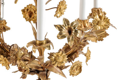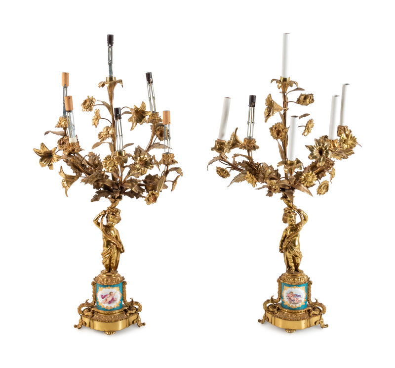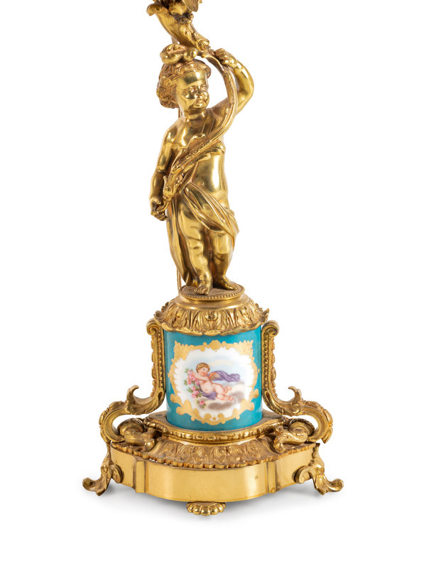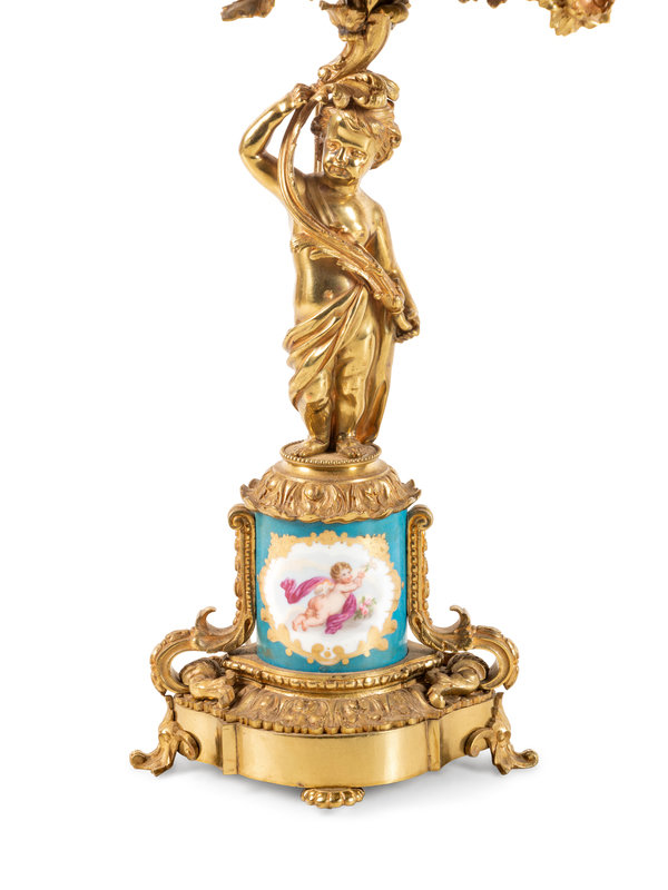 A Pair of Sèvres Style Porcelain Mounted Gilt Bronze Six-Light Candelabra