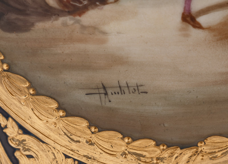 one painted cartouche apparently signed Huiblet, with interlaced Ls enclosing an F and marked France to the underside.